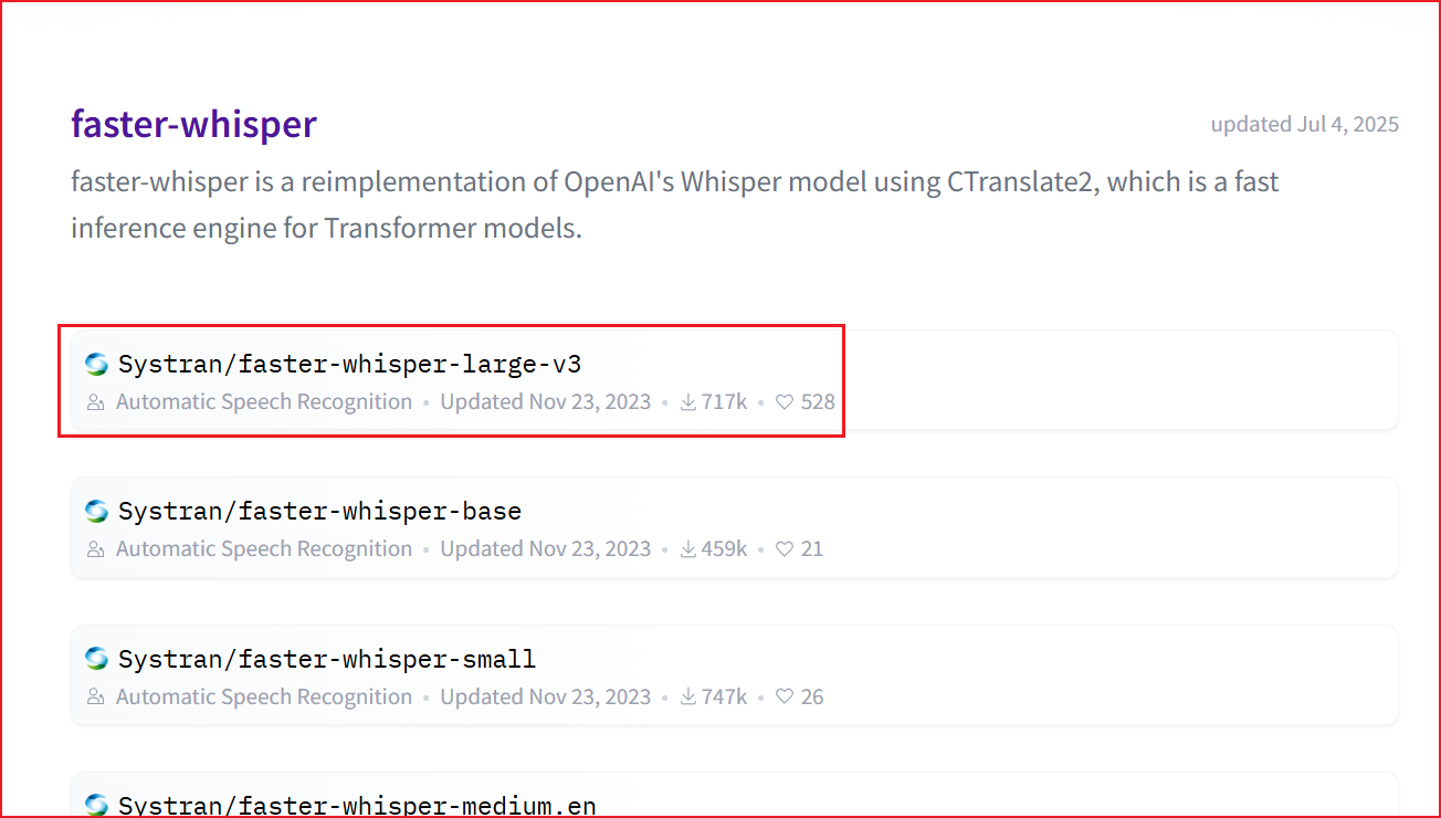 - (1)前往 【Hugging Face】 下载模型,推荐下载 faster-whisper-large-v3 ,效果最好