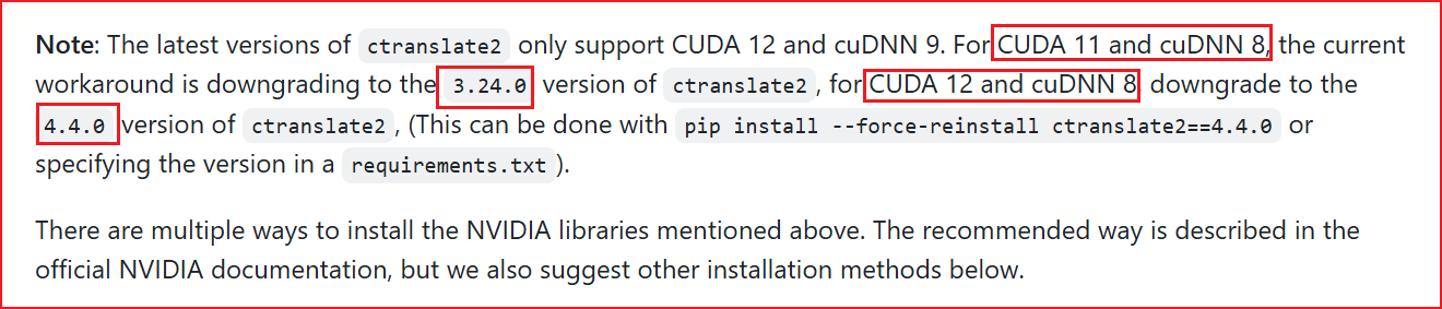 ctranslate2降级,使用指令pip install --force-reinstall ctranslate2==4.4.0- CUDA11 + cuDNN8 降级至 3.24.0