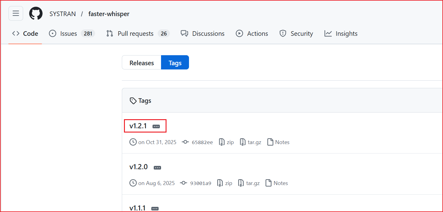 - (1)前往 faster-whisper ,选择 tags ,下载对应的版本,这边以最新版本 v1.2.1 为例