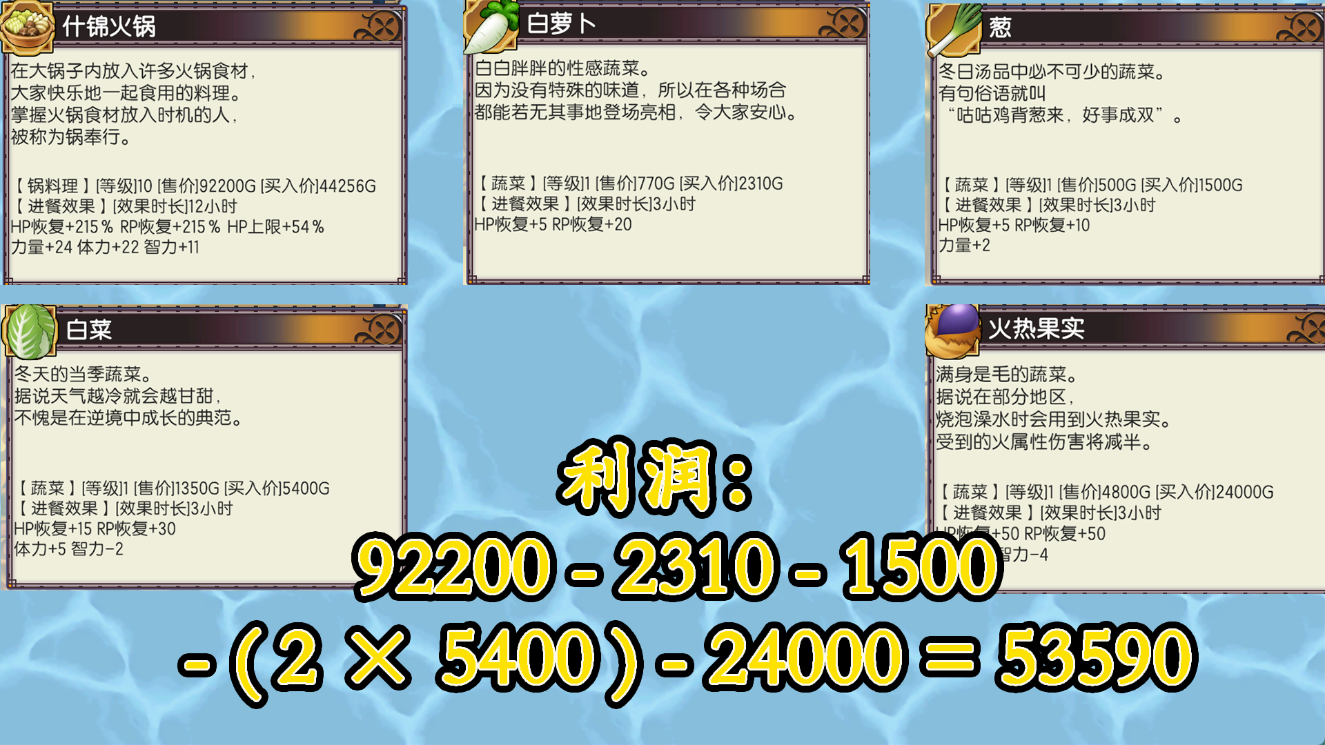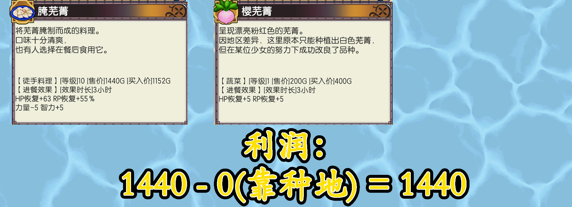 - 前期狂种樱芜菁,然后做徒手料理腌芜菁,全部卖出,能带来一笔不错的收益