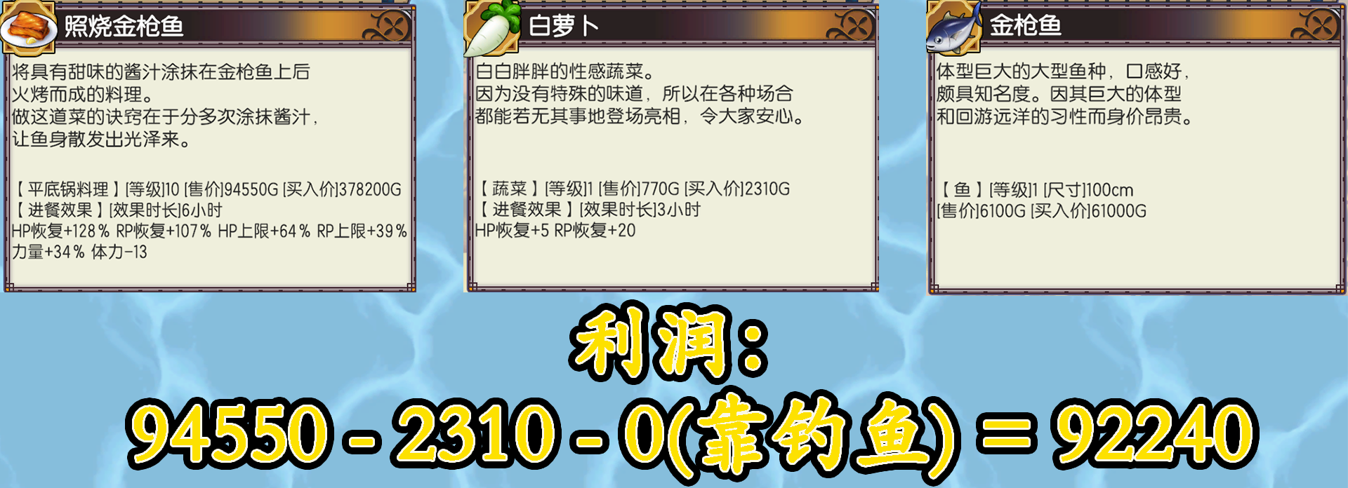 - 利润很高,但没法批量制作,制作数量全看钓的金枪鱼数量,无法实现利滚利,但可以作为利滚利的启动资金